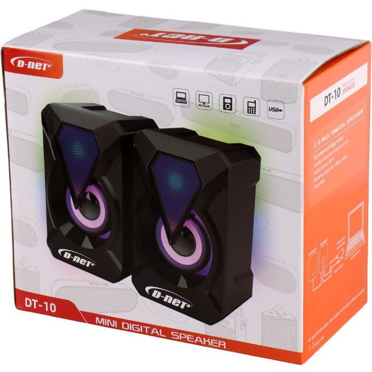 با برق مستقیم که اسپیکر دسکتاپ دی-نت مدل DT-10 از کامپیوتر یا لپ تاپ میگیرد نور پردازی زیبایی به کاربر می دهد که جذابیت محصول را دو چندان کرده و برای مصارف خانگی مناسب است .
