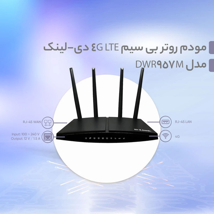 به منظور دسترسی به اینترنت با سرعت بالا برای کسب و کارهای کوچک و خانه میتوان از مودم روتر DWR-957M استفاده کرد. تنها با استفاده از یک سیم کارت 4G از مزایای LTE Cat 6 بهرهمند شوید. به صورت یک دستگاه یکپارچه، ویژگیهای مختلفی مانند ارائه تماس تحت شبکه VoLTE و وای-فای AC1200 را فراهم میآورد. استفاده از این محصول به آسانی صورت میگیرد و میتوان به سرعت دستگاههای موجود در شبکه را به اینترنت پرسرعت +4G متصل نمود. این مودم امکان تماشای ویدئوهای با کیفیت بالا به صورت آنلاین و امکان تماس صوتی بر روی اینترنت LTE را فراهم میآورد. همچنین میتوانید در هر نقطه از خانه به مرور صفحات وب بپردازید. با بهرهمندی از استاندارد وای فای 802.11b/g/n/ac مودم روتر +4G دی-لینک DWR-957M وای-فای AC1200 اتصال بیسیم با پهنای باند بالا را فراهم نموده است. مودم روتر رومیزی DWR-957M امکان اتصال به دو باند فرکانسی 2.4GHz و 5GHz را فراهم نمودهاست که به ترتیب سرعت وای-فای برابر با 300Mpbs و 866Mbps را ارائه میکند. همچنین سرعت دانلود و آپلود اینترنت LTE به ترتیب 300Mpbs و 50Mpbs میباشد که سرعت دریافتی بستگی به سرعت ارائه شده توسط اپراتور شبکه موبایل دارد. پورت FXS یک مبدل برای تبدیل سیگنالهای دیجیتال به آنالوگ و به منظور اتصال دستگاههای تلفن آنالوگ و FAX میباشد. مودم روتر رومیزی +4G دی-لینک D-link DWR-957M وای-فای AC1200 میتواند از طریق پورت WAN اینترنت را از دستگاهی دیگر دریافت کند. همچنین با 4 پورت LAN گیگابیتی میتوان اینترنت را از طریق اتصال کابلی به 4 کامپیوتر یا دستگاه دیگر منتقل کرد. پورت USB 2.0 تعبیه شده برای این مودم روتر، امکان به اشتراک گذاشتن فایلها از طریق اتصال حافظه ذخیره سازی را فراهم نموده است. مودم سیم کارتی TD-LTE هوآوی B622 به عنوان کالایی مشابه از +6 LTE CAT پشتیبانی میکند و سرعت بالاتری را برای دانلود فراهم می آورد. از موارد دیگر میتوان به وجود قابلیت امنیتی WPS در مودم روتر DWR-957M اشاره کرد که به کمک آن میتوان دستگاهها را به صورت امن و و سریع به شبکه اضافه کرد. همینطور رمزگذاری وای-فای WPA/WPA2 به حفظ امنیت دستگاهها کمک میکند.