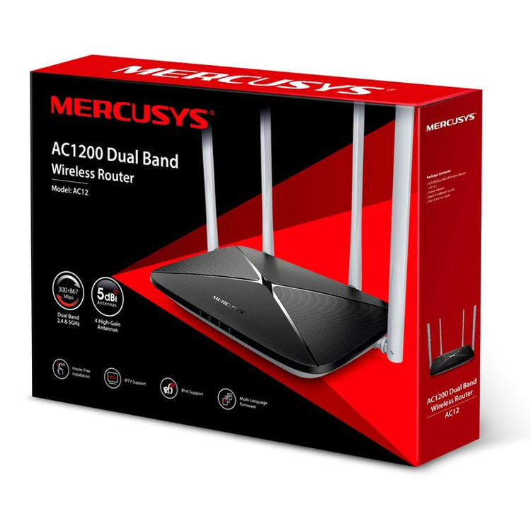 مودم مدل AC12 برند مرکوسیس به صورت بی سیم و با ۴ آنتن خارجی ۵dBi و فناوری پیشرفته می تواند به عنوان یک روتر عالی، پوشش گسترده تری از آنتن دهی بی سیم را ارائه دهد و قدرت دریافت سیگنال بی سیم را در سراسر خانه یا محل کار در ابعاد محیطی بزرگ فراهم کند. این روتر بی سیم WiFi مطابق با استانداردهای ۸۰۲٫۱۱a/n/ac و ۸۰۲٫۱۱b/g/n ارائه شده است که از سرعت بالایی پشتیبانی می کند تا کاربر با گوشی موبایل و دیگر دستگاه ها از سرعتی چند برابری در استفاده اینترنت برای کاربردهای متفاوت و حتی پخش آنلاین روان و بدون تاخیر ویدئوها لذت ببرد. این مودم سری AC1200 از باند دوگانه همزمان ۲٫۴ گیگاهرتز و ۵ گیگاهرتز برای اتصال بهره برده که هر دو باند همزمان کار می کنند تا تجریه سرعت بالای اینترنت و نیازهای چندین فعالیت را در دستگاه های مختلف برای کاربران برآورده نمایند. باند ۲٫۴ گیگاهرتز برای کارهای روزمره مانند گشت و گذار در اینترنت، ارسال ایمیل و … را با سرعت ۳۰۰ مگابیت بر ثانیه انجام می دهد و باند دوم با قدرت ۵ گیگاهرتز در مواقع لزوم وارد عمل می شود و سرعت را به ۸۶۷ مگابیت در ثانیه می رساند تا بتوانید همزمان بصورت آنلاین بازی کنید و پخش ویدئو HD و … را به راحتی دریافت و مشاهده کنید بر روی این مودم روتر ۴ آنتن Mercusys AC12، دکمه پاور دستگاه، دکمه ریست و کلید WPS تعبیه شده است.WPS امنیت در رمزگذاری دستگاه را قوی تر خواهد کرد تا از هک پسورد و استفاده از حجم اینترنت توسط دیگران جلوگیری شود. امنیت بی سیم این دستگاه از طریق رمزگذاری WPA-PSK / WPA2-PSK پشتیبانی می شود که از شبکه وای فای در برابر تهدیدات امنیتی و ورود مزاحمان محافظت کرده و یک دیوار دفاعی محکمی را به وجود خواهد آورد. در پشت این مودم یک سری درگاه های خروجی برای اتصال شبکه و دیگر دستگاه ها تعبیه شده که شامل ۳ عدد پورت اترنت LAN و ۱ عدد پورت اترنت WAN است. نشانگرهای LED نیز بر روی این مودم قرار دارند که وضعیت اتصال و برقراری اینترنت را نشان می دهند. یک سری فناوری برای کنترل مدیریت آسان تر برای این دستگاه بی سیم WiFi فراهم شده مانند Guest Network Access که دسترسی Wi-Fi را برای مهمانان به صورت شبکه ای در خانه یا دفتر کار به اشتراک می گذارد و پروتکل IPv6 که بهره وری از شبکه و سرعت بالا در مشاهده وب سایت ها و پخش آنلاین را بهینه سازی می کند