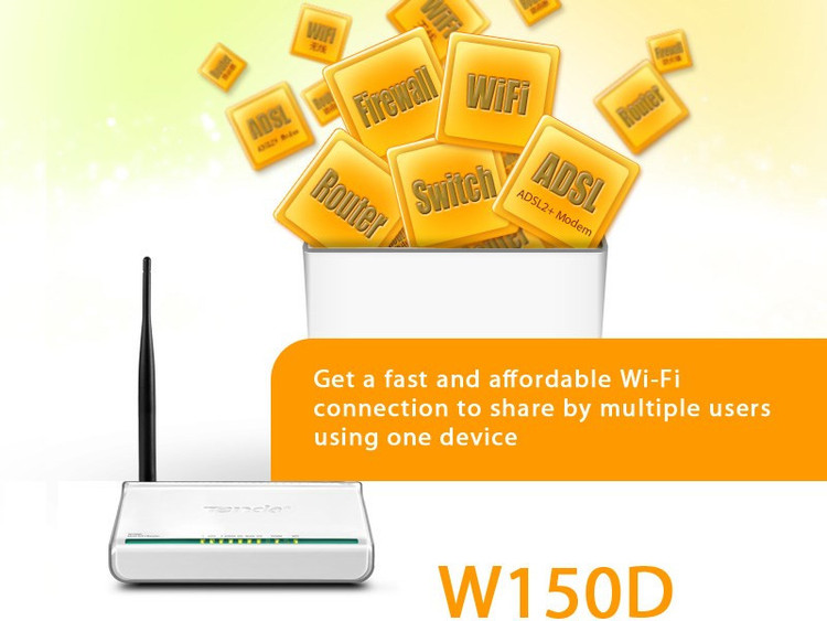 • تندا W150D یک مودم ADSL و روتر بیسیم است که دارای 4 عدد پورت شبکه (RJ-45) صدمگابیتی است. این مودم-روتر از استاندارد سری N بهره میبرد و سرعت 150 مگابیت در ثانیه را به شما ارایه میدهد. شما میتوانید با استفاده از این مودم-روتر یک شبکه بیسیم کوچک و خانگی مورد ایجاد و از آن استفاده نمایید. مودمهای سری N به صورت تئوریک دارای بردی در حدود 3 برابر مدلهای سری G هستند و پهنای باند آنها نیز تا 3 برابر بیشتر میباشد. W150D در قسمت بیسیم از آخرین استانداردهای امنیت مانند WPA2 بهره میبرد. این مودم-روتر توانایی کار با سیستم عاملهای مختلف را دارا بوده و به راحتی تنظیم میشود و با تمامی سرویس دهندههای اینترنت (ISPها) در ایران سازگار است. چیپ مورد استفاده در مودم-روتر تندا W150D ساخت Broadcom است و از کیفیت خوبی برخوردار میباشد. W150D قابلیت اتصال 12 دستگاه به صورت بیسیم و از طریق Wi-Fi و 4 دستگاه به صورت باسیم و از طریق 4 پورت شبکه را دارد. همراه با این مودم-روتر یک اسپلیتر، کابل شبکه و کابل تلفن نیز عذضه میگردد.