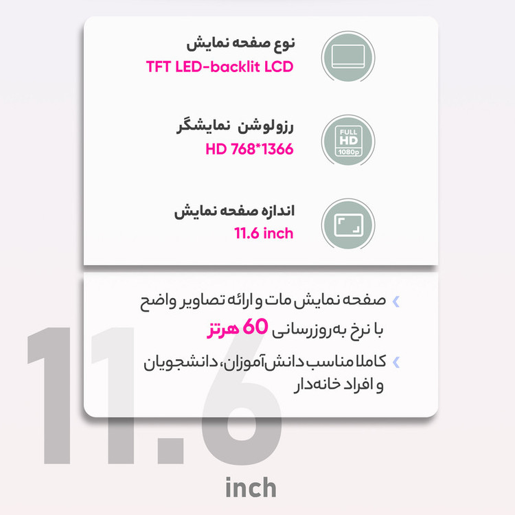 دقت صفحه نمایش : HD|1366x768 پیکسل