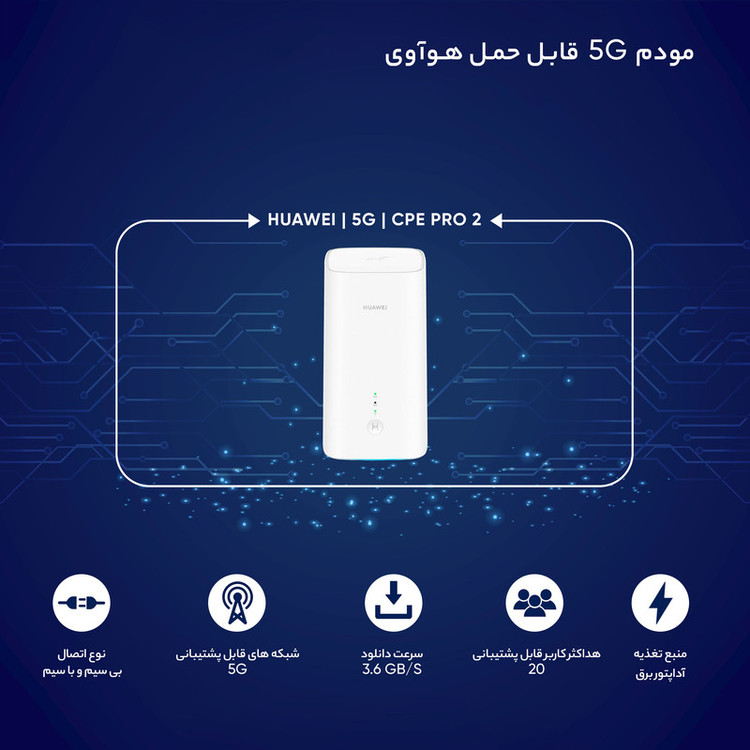مودم رومیزی H122-373 5G CPE Pro 2 جدیدترین محصول شرکت هوآوی است. این مودم از فناوری شبکه 5G پشتیبانی میکند. شاخصهی اصلی این مودم سرعت بالای آن بوده چرا که سرعت دانلود آن تا 3.6Gbps قابل افزایش است. این مودم ظرفیت اتصال 20 دستگاه (گوشی، تبلت، لپ تاپ و غیره) را به طور همزمان دارد که تعداد بسیار بالایی محسوب شده و برای محیطهای کار که تعداد نفرات به نسبت منازل بیشتر است، بسیار کاربردی است. از ویژگیهای دیگر آن میتوان به قابل حمل بودن و همچنین راه اندازی راحت آن اشاره کرد. یکی از خصوصیات مثبت یک مدت، نصب راحت آن است تا فرد را با مشکل روبهرو نکند و مودم جدید هوآوی این خصوصه را به خوبی دارا است. این مودم از باندهای فرکانسی (5G (n1/n3/n5/n/7/n28/n38/n40/n41/n77/n78/n79 پشتیبانی میکند. گفتنی است منبع تغذیه این مودم آداپتور برق است.