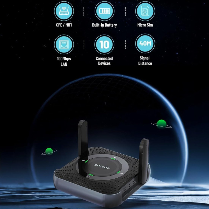 مودم روتر قابل حمل پرودو سری جدید و اصلی مدل PD-4GCPMF-BKGY با ظاهری شیک و جذاب ، با ابعادی جمع و جور و قابل حمل طراحی شده است که به صورت بیسیم و باسیم قابل استفاده است . با استفاده از این روتر میتوانید هم در خانه و هم در فضای بیرون ، همواره به اینترنت متصل بمانید .این دستگاه امکان اتصال به اینترنت 4G را فراهم میکند و بیسیم بودن آن به شما این امکان را میدهد که دستگاه را با خود به محل کار ببرید و یا در سفر نیز آن را با خود حمل کنید .به لطف باتری 4000 میلی آمپری با هربار شارژ کامل تا 12 ساعت به صورت بیسیم میتوانید از آن استفاده کنید .با حداکثر سرعت پخش جریانی 150 مگابایت بر ثانیه ( DL ) و 50 مگابایت بر ثانیه ( UL ) در هر مکانی از سرعت اینترنت لذت ببرید .با فرکانس 2.4 گیگاهرتز اتصال پایدار و بدون تاخیر را در محیطهای مختلف تضمین میکند .دارای درگاه سیم کارت است و از یک عدد سیم کارت نیز پشتیبانی میکند .همزمان تا 10 دستگاه را میتوانید از طریق Wifi به آن متصل کنید .از قابلیت CPE و Mifi نیز پشتیبانی میکند . دستگاه MiFi یک روتر یا نقطه اتصال کوچک است که معمولاً روی یک اتصال سلولی کار میکند و از دادههای شبکه برای برقراری اتصال Wi-Fi برای لپتاپ ، تبلت و سایر دستگاهها استفاده میکند .یکی از امکانات خاص این مودم دارا بودن پورت Lan می باشد که برای اتصال به دستگاه هایی مانند رسیور و هایپر لینک ایده ال می باشد .
